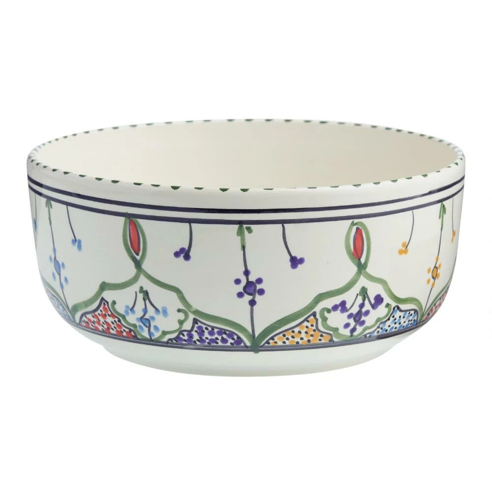 The Amira serving bowl is hand-painted by Tunisian artisans with a traditional design in a vivid kaleidoscope of colors. A one-of-a-kind showcase of North African craftsmanship, this character-rich plate is designed with a rim to help hold sauces and dressings in.