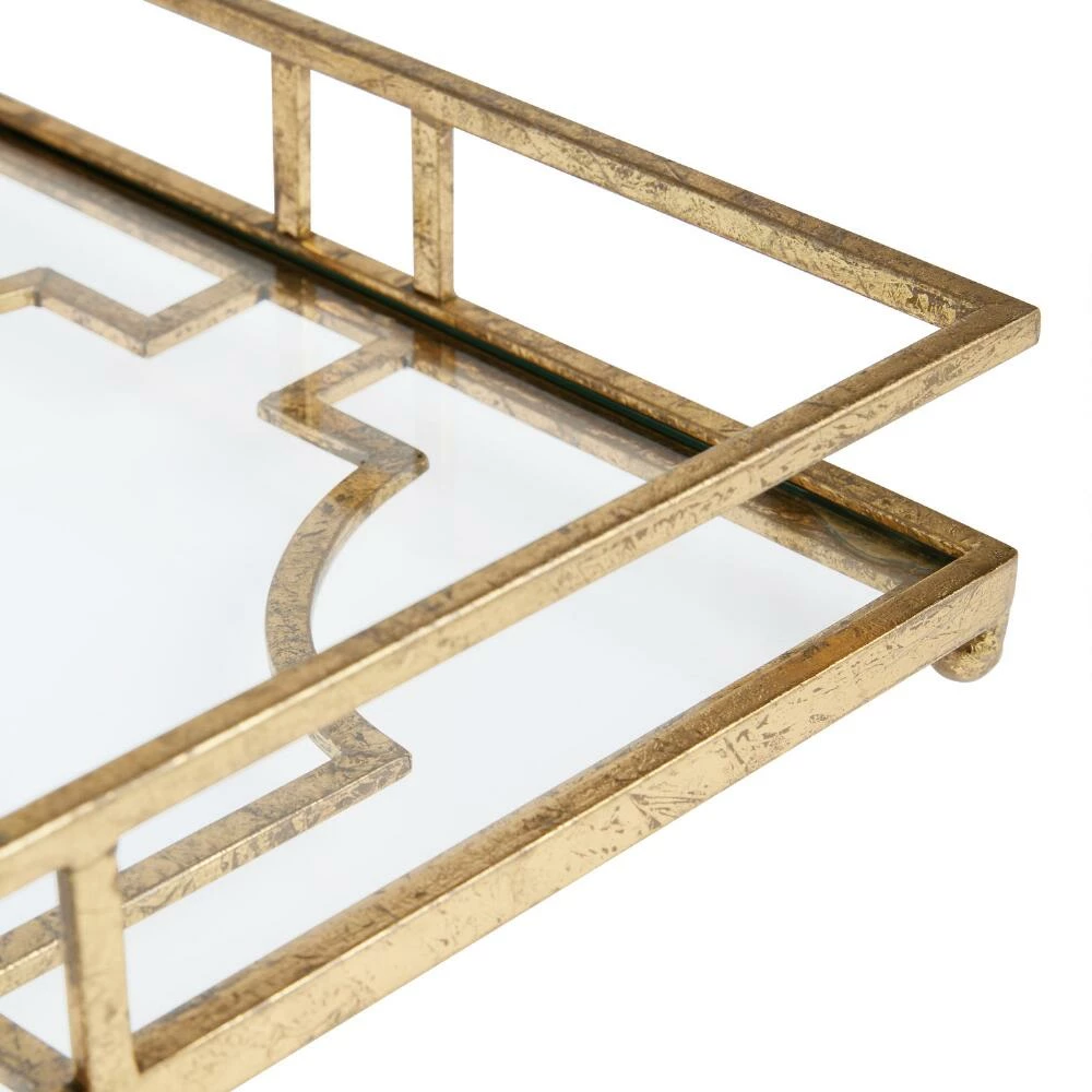 Serve up a touch of vintage style with this geometric glass bar tray featuring a hand painted antique-gold frame with a notched base. Pairing artistic lines with ample surface area, this art deco-inspired tray will add functional chic to your home bar service collection.