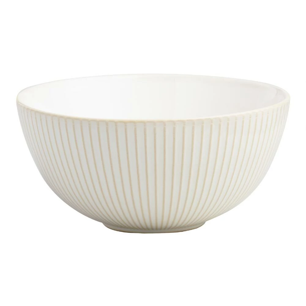 Bring a casual café vibe to mealtimes with this chic stoneware bowl. In a textured off-white stripe design, this matched pair mixes beautifully with our other stoneware pieces to create a uniquely dimensional table for everyday meals or entertaining.