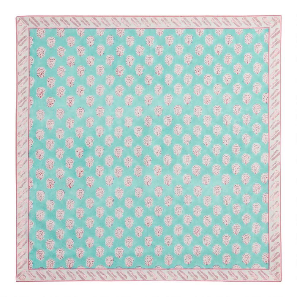 Bring a pop of color and pattern to your dining table with our vibrant cloth napkins from India. Adorned with a bright blue and pink block print pattern with a contrasting border, these lively hand-printed napkins are 100% cotton and machine washable for convenient reuse meal after meal.