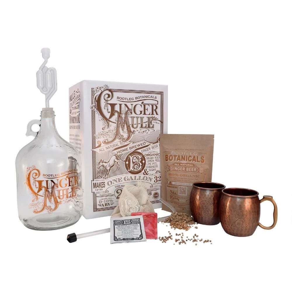 - Kit includes glass fermentation jug, 2 Moscow mule mugs, LCD thermometer, racking cane with siphon hose, airlock with rubber stopper, no-rinse cleanser, mesh brewing bag, a drinking game, beer coasters, organic ingredients, brewing yeast and detailed instructions for making both alcoholic and non-alcoholic ginger beer
