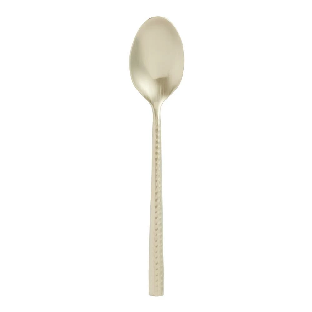 A fabulous twist on an everyday dining staple, our exclusive teaspoon has a warm champagne-gold finish and a modern hammered texture. An elevated, petite-sized spoon that’s sure to impress guests, it’s dishwasher safe for easy cleanup.