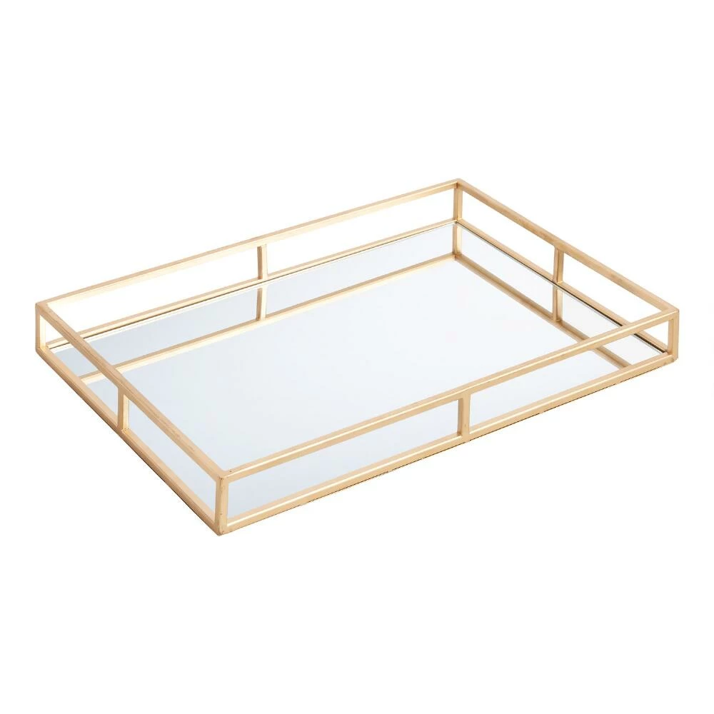 Serve up drinks in glamorous fashion with the Cole bar tray featuring a mirrored surface and a glistening antique brass finish on the sides. Perfect for parties, it makes a refined display for bar tools, cocktails, small appetizers or an ambient candle.