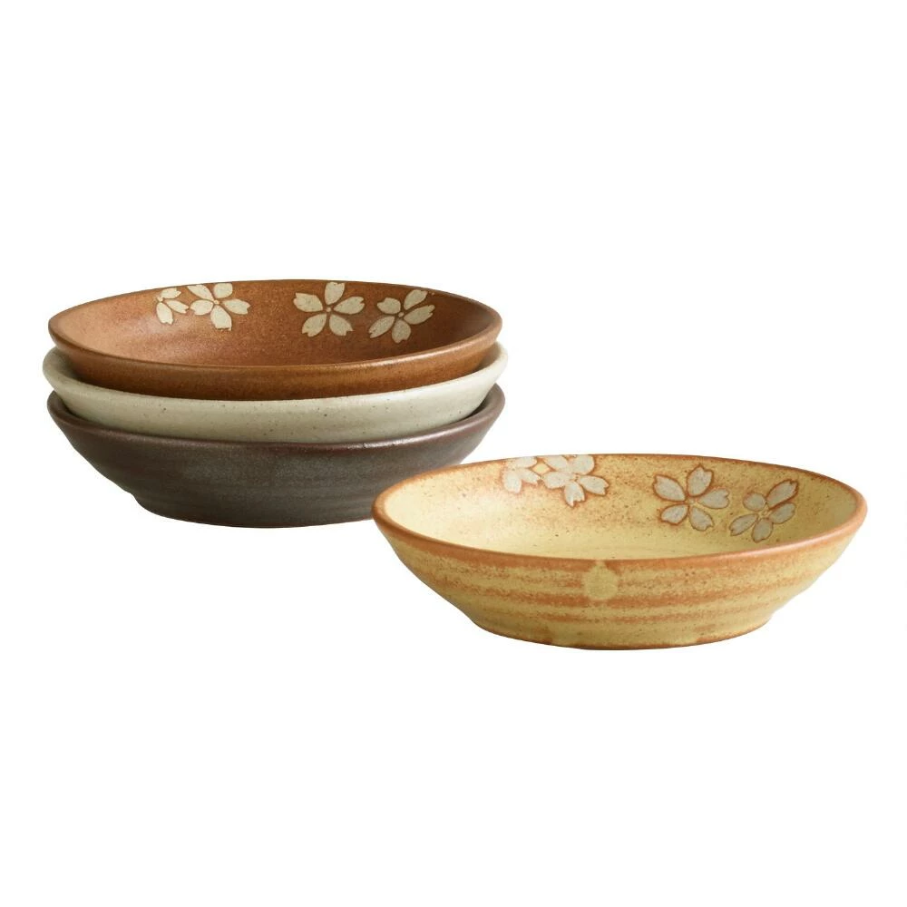 Set an elegant, tranquil table with our rustic dip bowl inspired by traditional Japanese design. Made of stoneware and organically textured, the set includes dishes in four earthy colors, each adorned with a delicate cherry-blossom motif. Mix with your current place settings or match with other pieces from the collection for elevated entertaining and everyday dining.