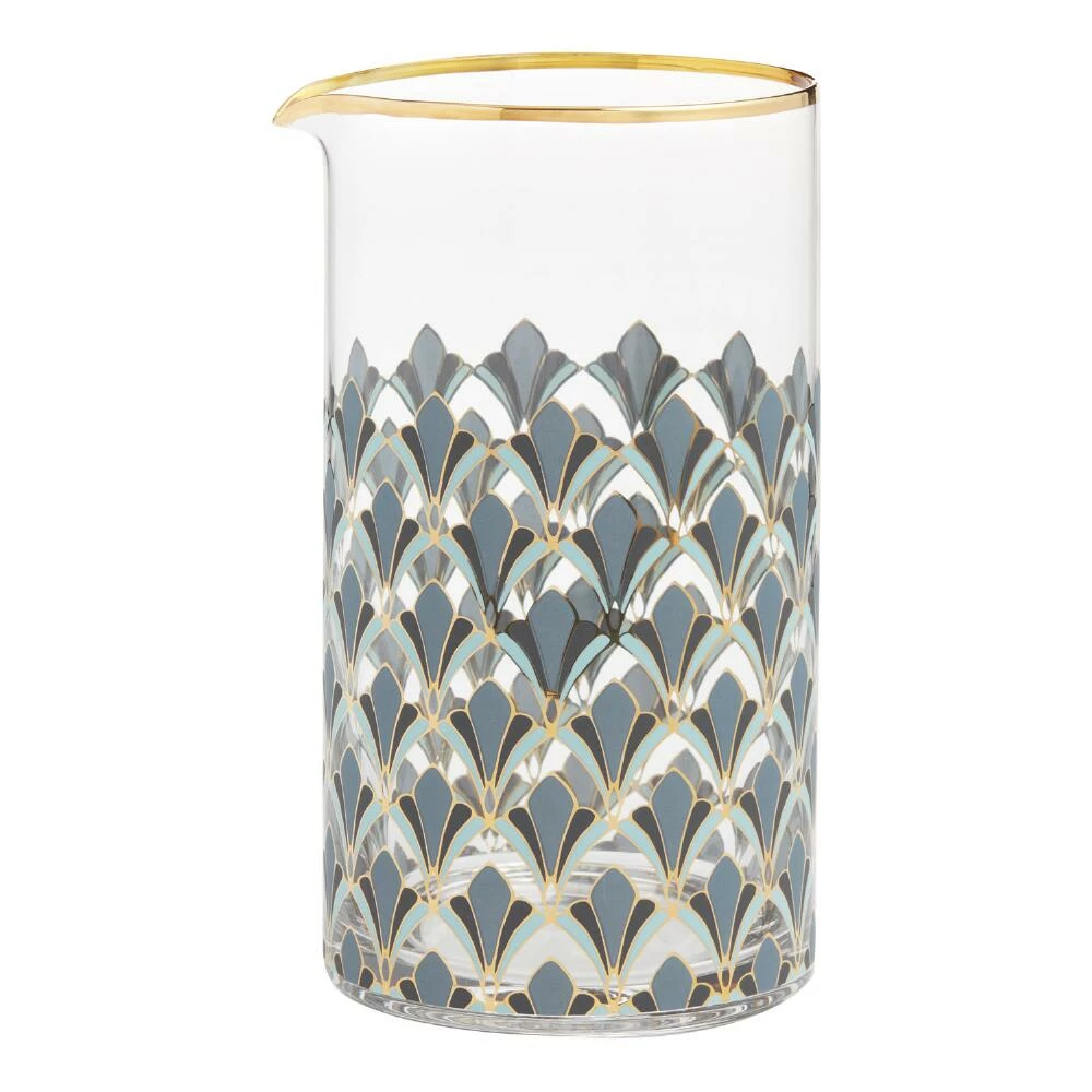 Inspired by the art-deco elegance of 1920s Paris, our cocktail mixing pitcher is decorated with the period’s hallmark geometric forms. The allover fan motif in shades of blue is accented in luxe metallic gold, bringing glamour and definition to the design. A small spout lets you pour your sidecars and Sazeracs with precision.