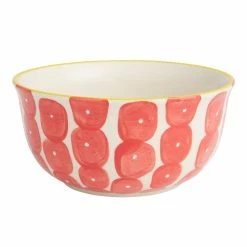 Make a modern statement on your dining table with this stoneware noodle bowl, hand-painted with a bold geometric design and colorful contrasting rim. Available in red-orange, yellow and blue, each bowl is artfully adorned with wavy stripes and dots. This kitchen staple is perfect for large portions of ramen, stir-fries, salads and more. Pick up a few in coordinating colors or mix and match for a unique dinnerware display.