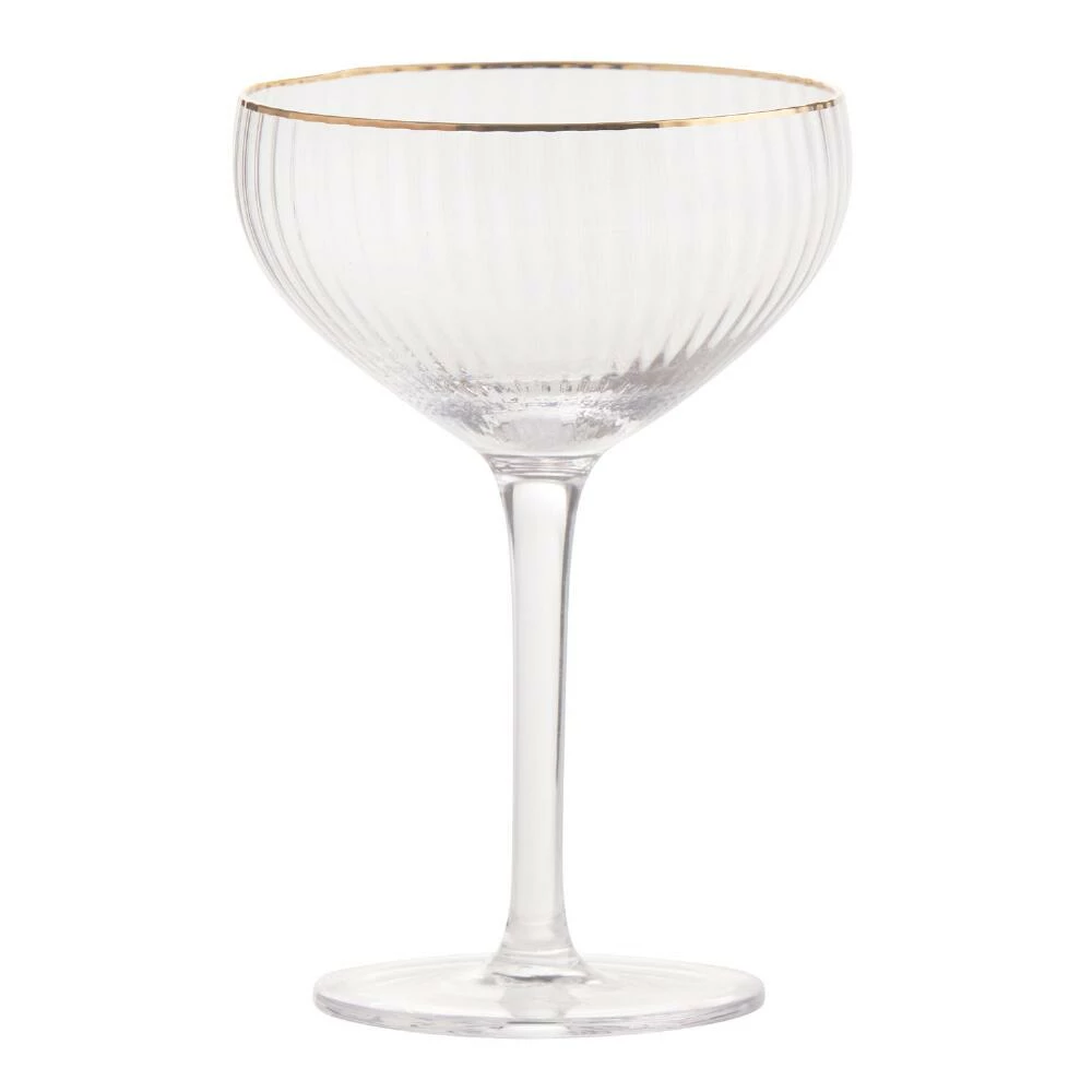 With a metallic-gold rim for that just-right touch of luxe, this cocktail glass is embellished with a subtle ribbed texture for added sophistication. A vintage-inspired classic, our stemmed coupe glass adds new charm to chilled cocktails.