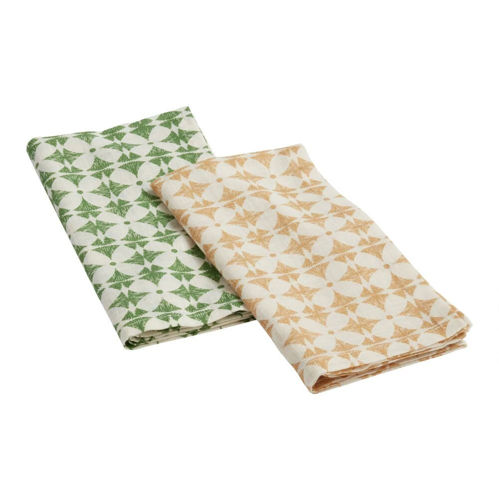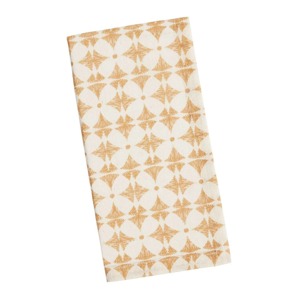 Inspired by traditional hand block printing, our ivory napkins feature a repeat pattern of wedge shapes and dots that form a simple abstract flower design. Full of artisanal charm and available in warm gold or green, they lift your tablescape with subtle geometric style.