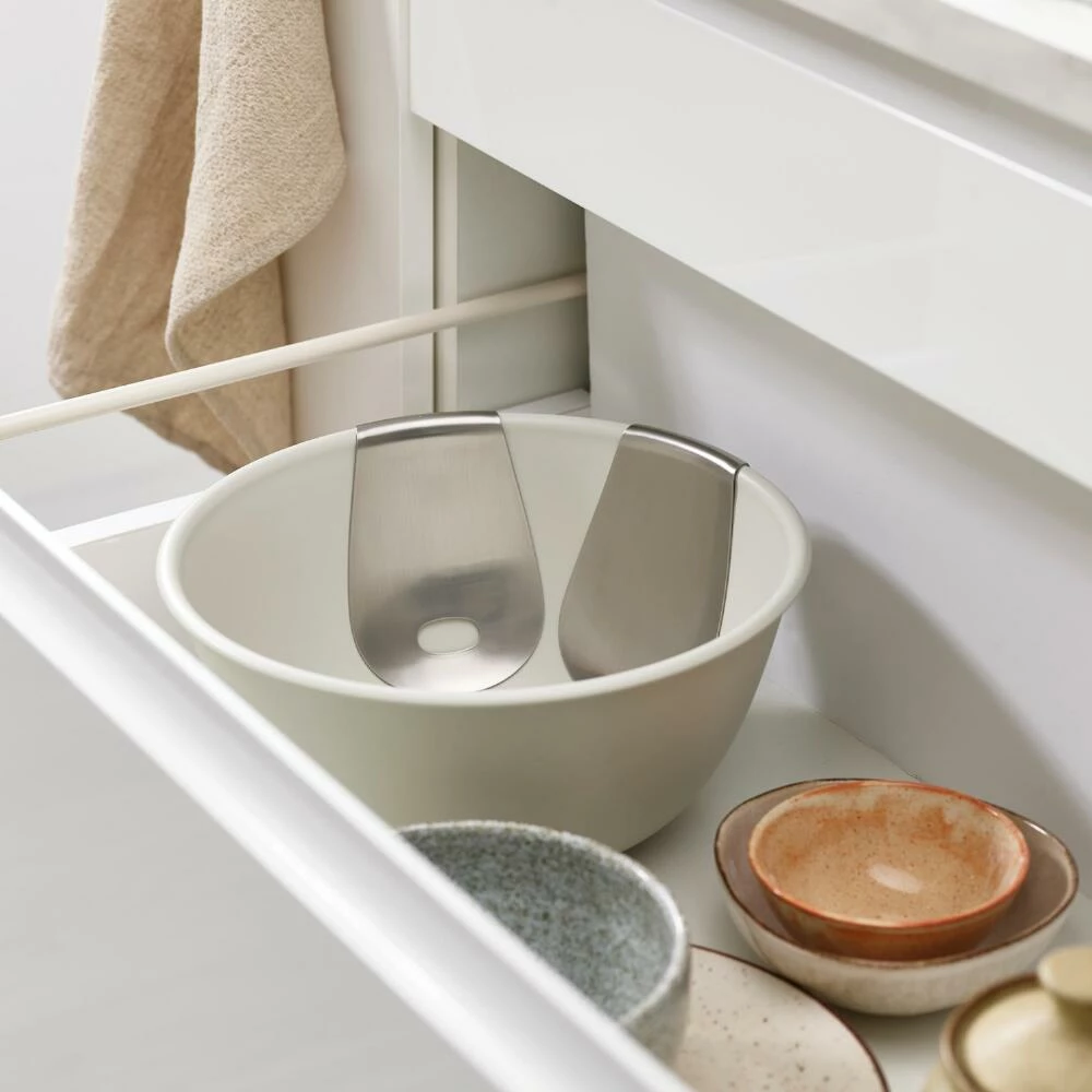 This Joseph Joseph serving set includes two salad servers that rest neatly on the rim of a large beige bowl so they’ll always be there when you need them. Bringing neutral modern design to the dinner table, the large serving bowl and sleek stainless-steel utensils are ideal for prepping, mixing and serving green salads, rice dishes, pastas or noodles and crowd-pleasing desserts.