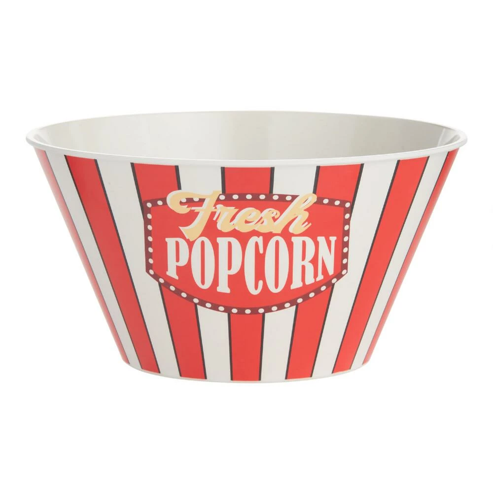 Featuring a retro red and white striped design inspired by vintage concession stands, our large bowl is ready to serve fresh, hot popcorn on movie night. Crafted from fast-growing bamboo fiber and durable melamine with a wide square rim that invites sharing, this classic snack bowl is dishwasher safe for easy cleanup.