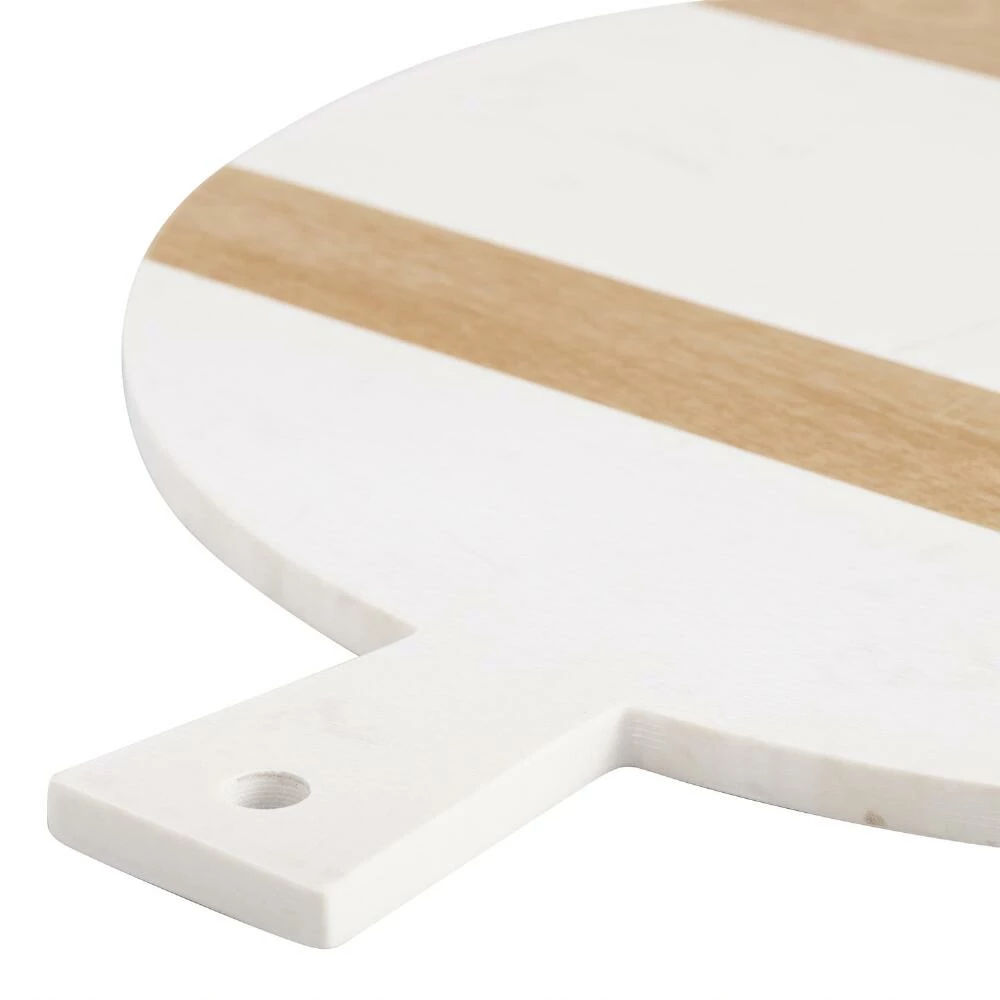 Crafted of white marble with natural mango wood stripes that add a unique texture, our exclusive large round paddle cutting board is ideal for preparing and serving cheese samplers and other small bites.