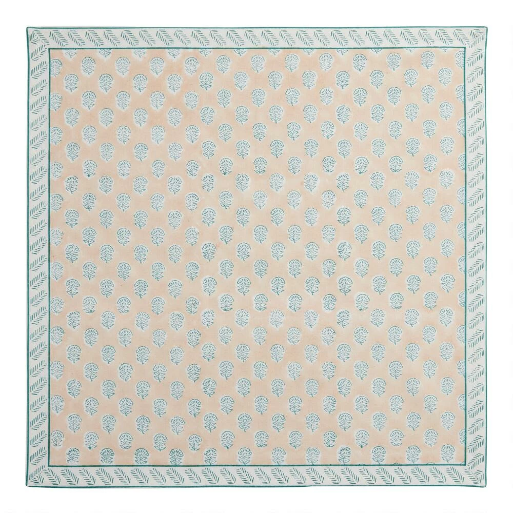 Bring a pop of color and pattern to your dining table with our vibrant cloth napkins from India. Adorned with a light orange and blue block print pattern with a contrasting border, these lively hand-printed napkins are 100% cotton and machine washable for convenient reuse meal after meal.