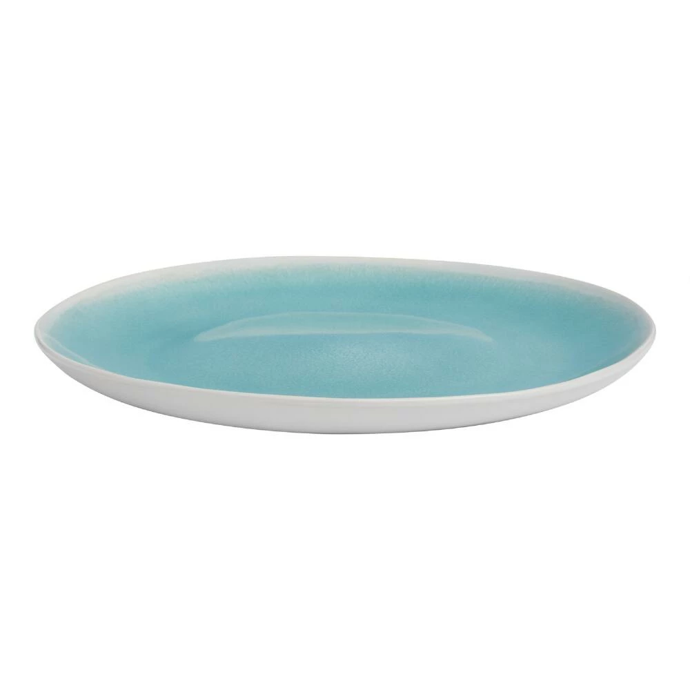 With an aqua interior and white exterior for charming contrast, this dinner plate makes everyday dining or entertaining a cool coastal affair. Made of durable stoneware with a reactive glaze that ensures no two pieces are exactly alike, it adds a fresh pop of color to any place setting.