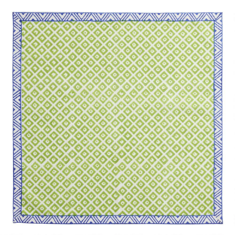 Bring a pop of color and pattern to your dining table with our vibrant cloth napkins from India. Adorned with a bright green block print pattern with a contrasting blue border, these lively hand-printed napkins are 100% cotton and machine washable for convenient reuse meal after meal.