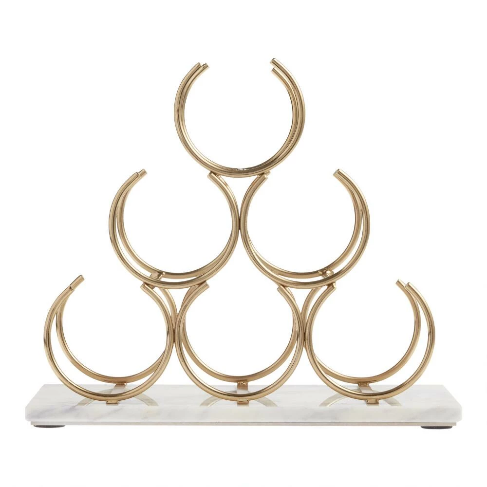 Give your selection of fine wines pride of place on your sideboard in this elegant rack made of marble and iron with a gold finish. The stone slab supports a graceful pyramid formation of sculpted metal cradles that hold six standard wine bottles.