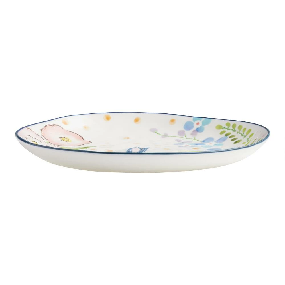 A charming pop of color for your spring dining table, this organically shaped salad plate is hand-painted for a special, one-of-a-kind finish. It sets a sweet table with pink and blue flowers, a blue bunny and green foliage.
