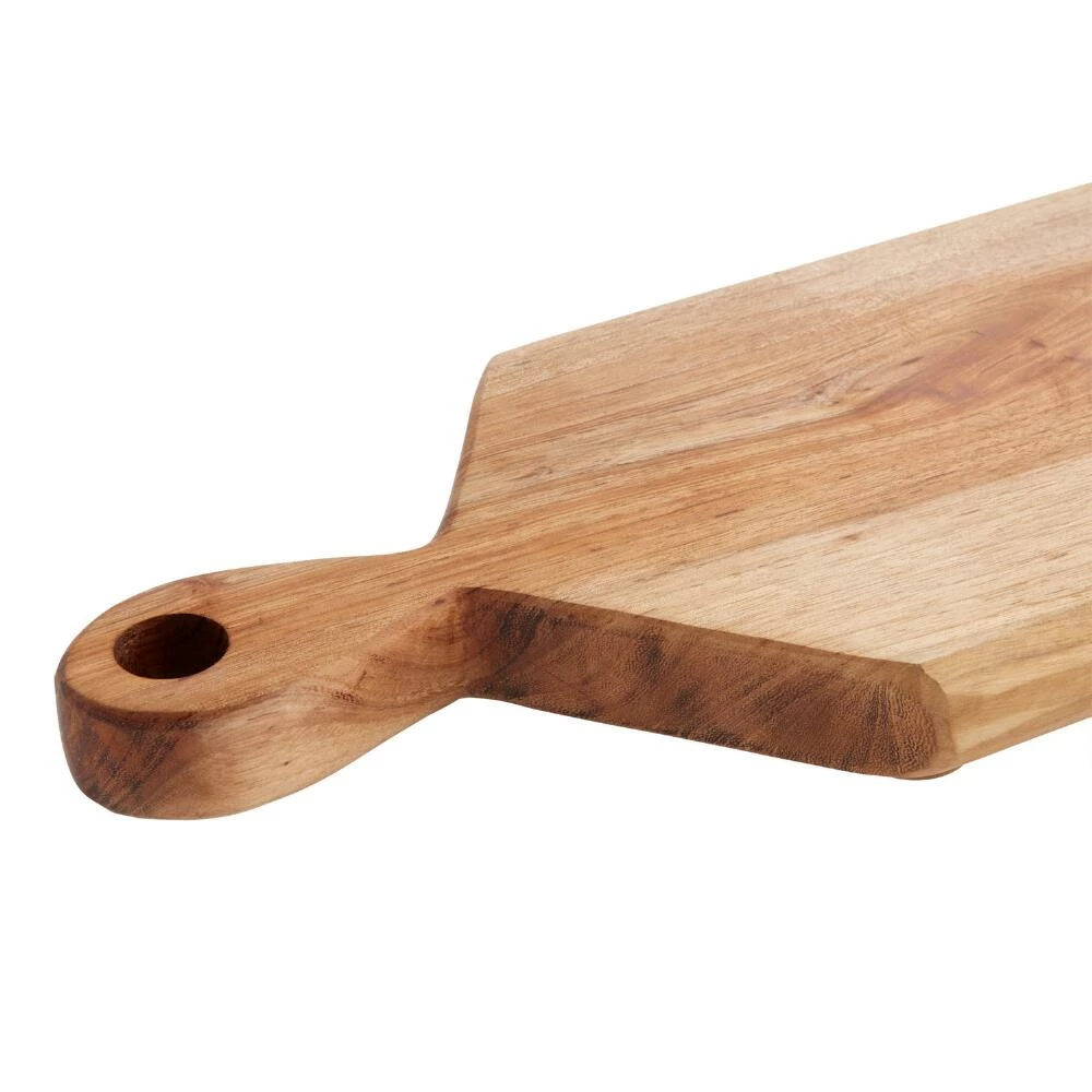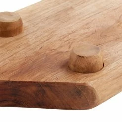 Made in Indonesia of 100% acacia wood, this long and slender serving board features a tapered handle and four petite round feet. Its rustic natural appeal and footed base ensures it presents appetizers, charcuterie and cheeses beautifully. Displaying unique variations in grain pattern and hue, this farmhouse prep board is a one-of-a-kind kitchen gift.