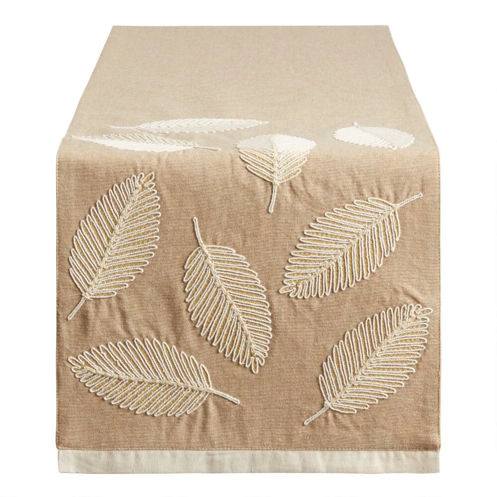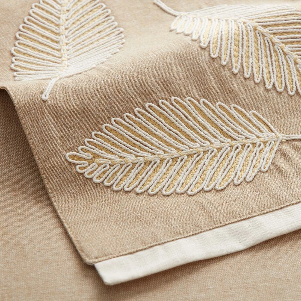 Elevate everyday table settings with our exclusive table runner. Embroidered with ivory leaves, this versatile runner has a neutral color palette that makes it easy to layer with different table linens.