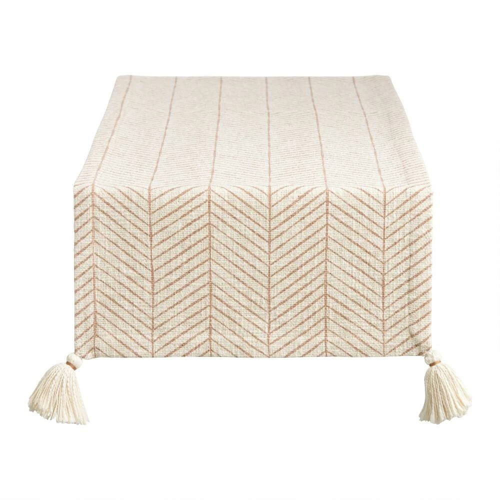 Create an aura of natural elegance at your dinner table with our textural cotton table runner featuring a geometric chevron print and corner tassels. Charming and durable, this runner radiates warm hospitality as the centerpiece of your dinner gatherings.