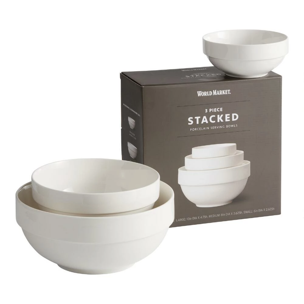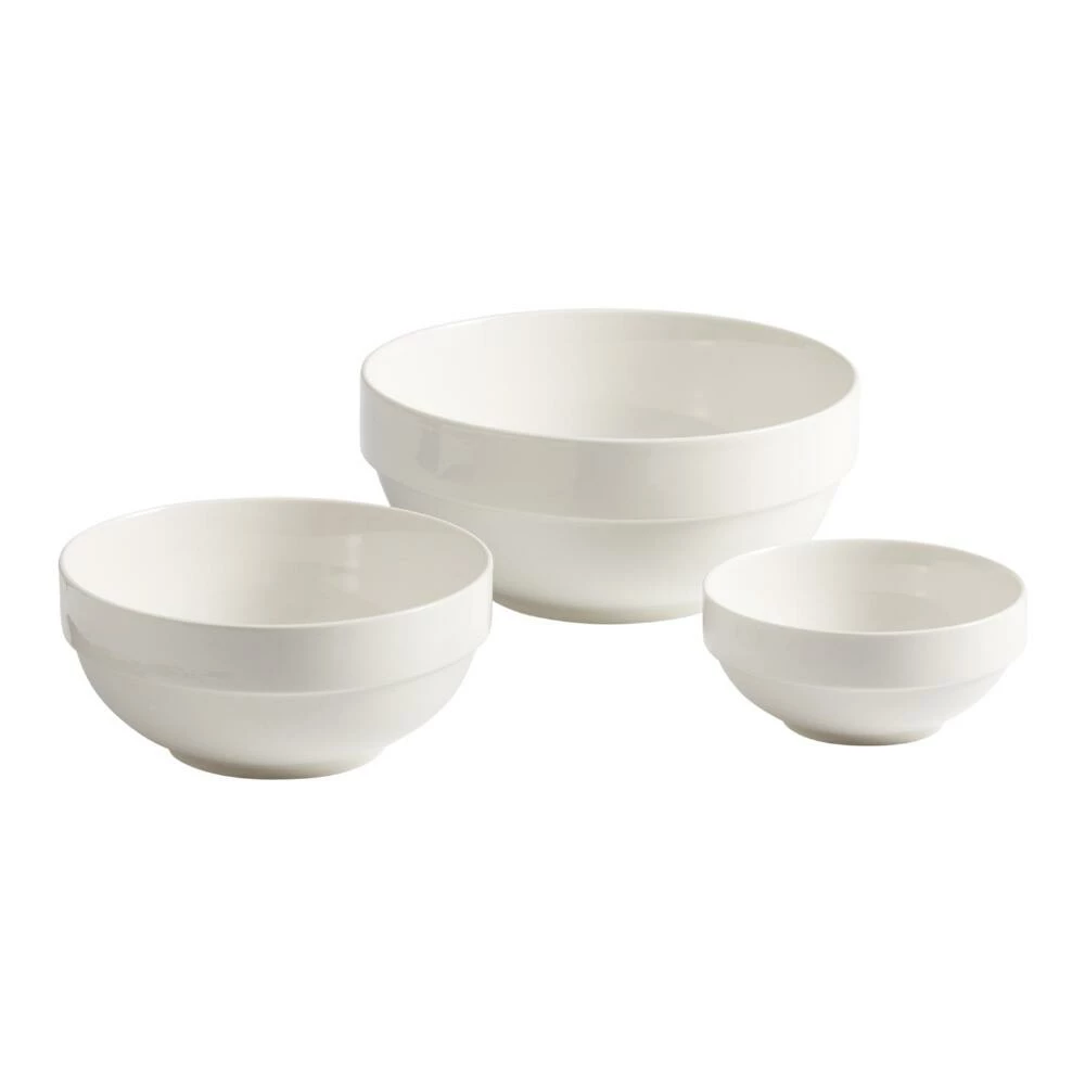 Nesting neatly in a stack to save space and streamline your cupboards, our timeless off-white glazed serving bowls are perfect for everyday small-space living. Including three versatile sizes, this set is perfect for presenting a coordinated look at mealtime.
