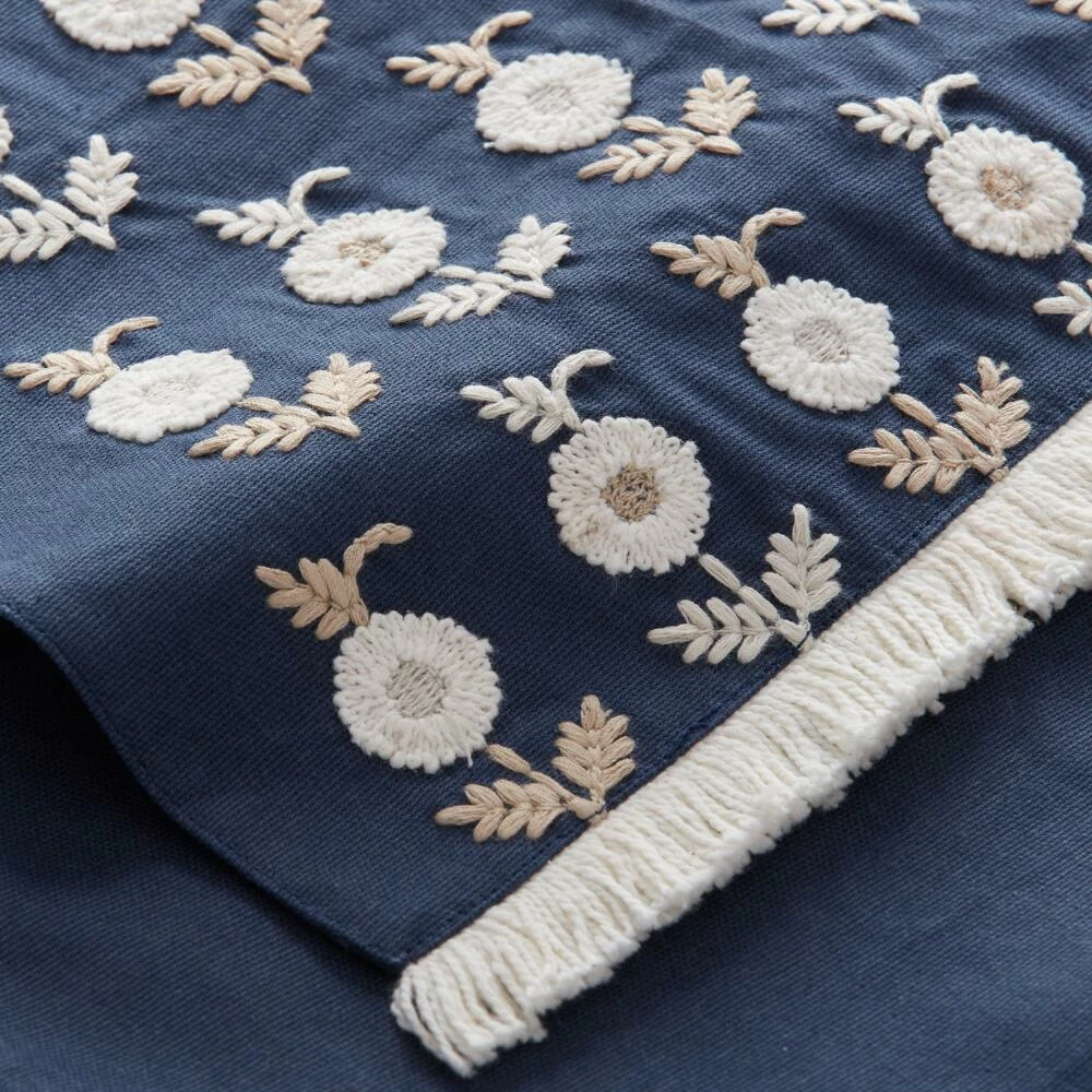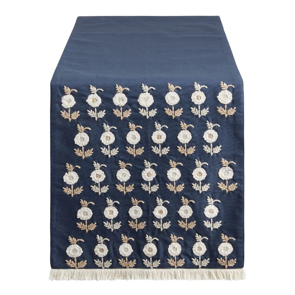 Our exclusive table runner is embroidered with rows of petite white flowers on a navy ground. A simple way to transform your table setting, this charming runner adds color and pattern to everyday meals and festive gatherings.