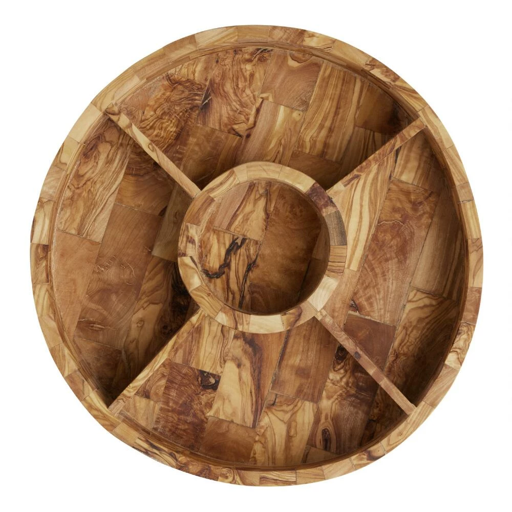 Made in Tunisia of olive wood with a natural finish, our substantial serving tray is a one-of-a-kind beauty. With unique variations in the natural color and organic grain, this sectioned tray makes a timeless presentation for your favorite chip and dip combinations and veggie trays or a gorgeous gift for any hostess.