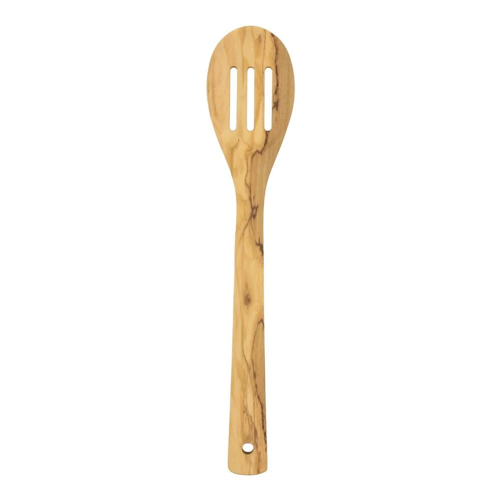Featuring the gorgeous natural grain patterns of Italian olive wood, our exclusive slotted serving spoon is an elegant and durable kitchen essential. A beautiful utensil with a slotted head and a comfortable handle with a hanging loop, it’s perfect for mixing, serving and straining fats or liquids. This large cooking spoon is easy to clean and is safe to use with nonstick pots, pans or bakeware.