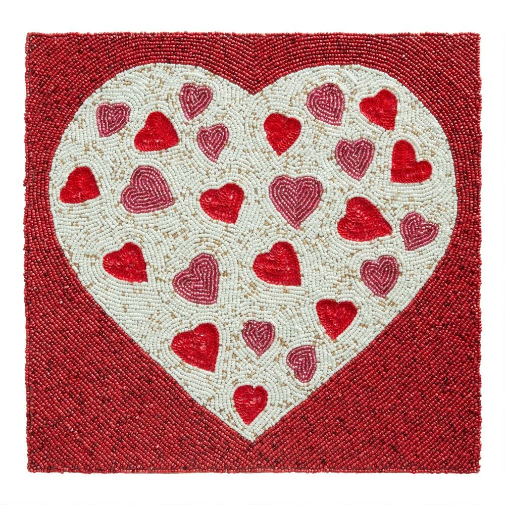 Adorned with an intricate white, pink and red heart design made by hand from thousands of tiny beads, our placemat lends a sweet sparkle to your table setting. It’s an adorable addition to a Valentine’s Day gathering or any romantic occasion year-round.