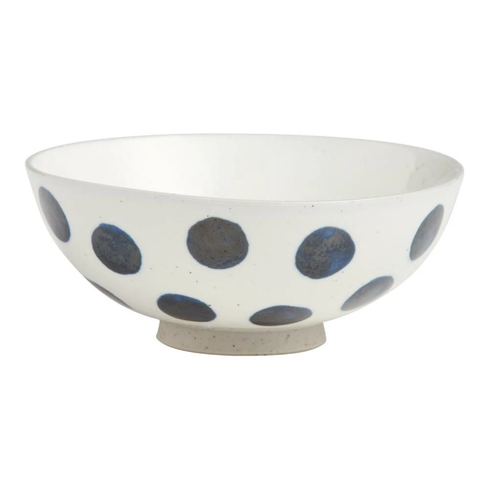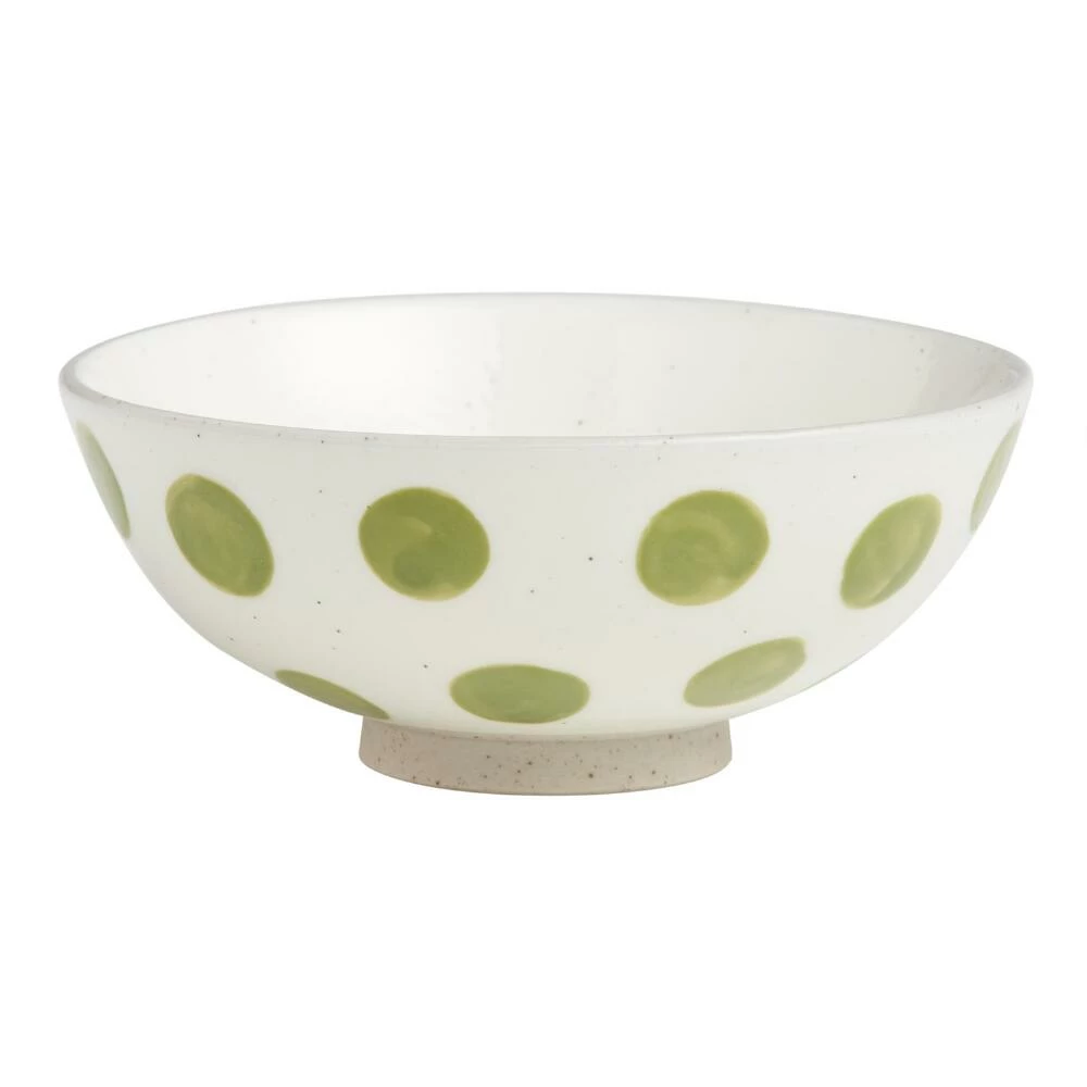 Large bold hand-painted polka dots give this ivory rice bowl a stylish modern appeal that’s also just a bit playful. Lending a polished touch to any meal, this essential dinnerware piece is specially designed to serve up Asian-style rice. Choose between green and dark-blue polka dots, or mix and match your way to your ideal set.