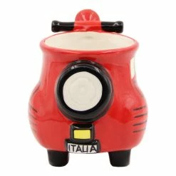 Rev up your morning routine with our scooter-shaped red mug. Artfully detailed to resemble a zippy little two-wheeler seen everywhere in Italy, this street-smart cup proudly displays the colors of the Italian flag on the front. It makes a sweet, unique gift for the caffeine-lover in your life when paired with tea, coffee or authentic espresso.