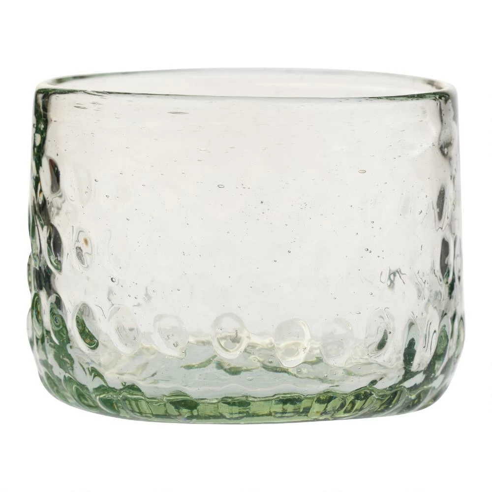 Serve drinks in timeless style with this wide double old-fashioned cocktail glass made of recycled glass and featuring a textural dimpled surface. Handcrafted by skilled artisans in Mexico, this bar glass has a weighty feel and makes a unique vessel for your favorite spirits.