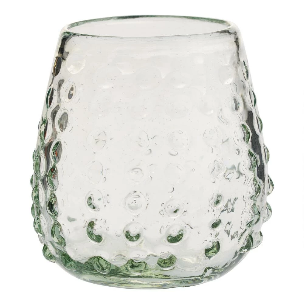 Serve drinks in timeless style with this stemless wine glass made of recycled glass and featuring a textural dimpled surface. Handcrafted by skilled artisans in Mexico, this drinking glass has a weighty feel and makes a unique vessel for your favorite wines.
