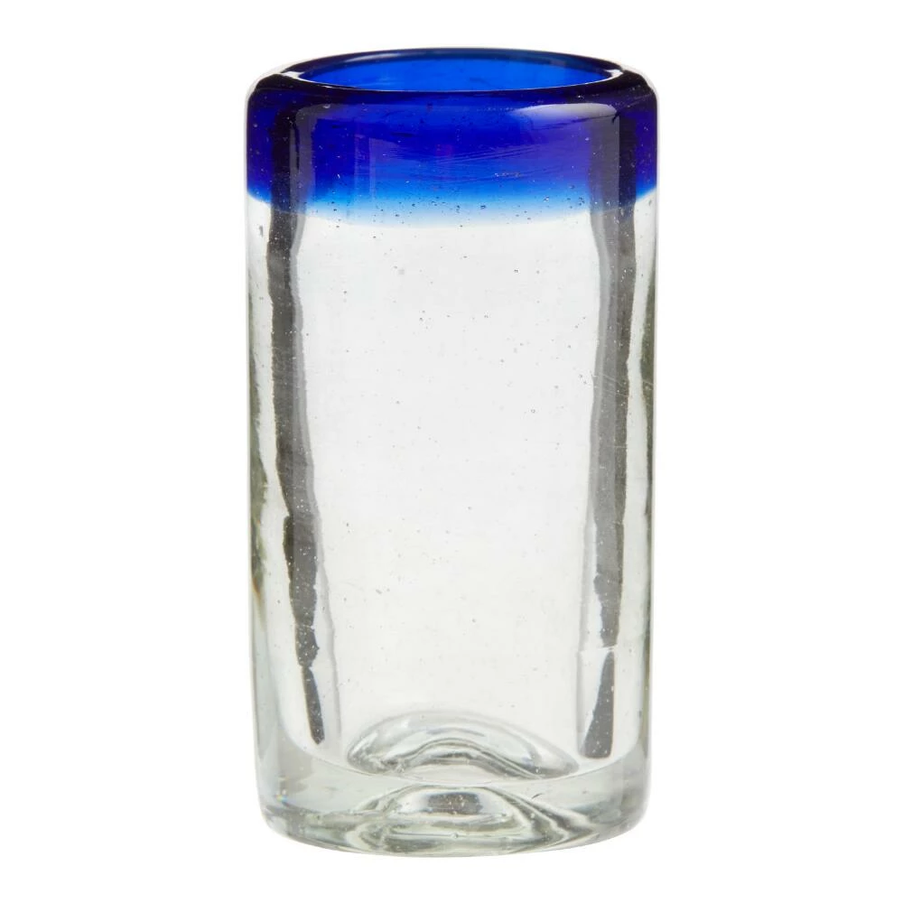 Our festive shot glass is handcrafted of thick glass with a brilliant blue rim, a traditional design touch from Mexico. Perfect for outdoor entertaining or spicing up your next indoor fiesta, this high-quality bar glass has a comfortable weighty feel and distinctively artisan look.
