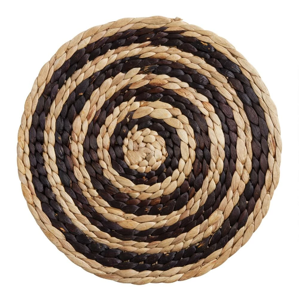 Add an earthy element to your table setting with our round placemat made from renewable water hyacinth. Intricately woven by skilled artisans with a sophisticated alternating black ring design, this natural fiber placemat is an eco-chic treasure for your indoor or outdoor dining table.