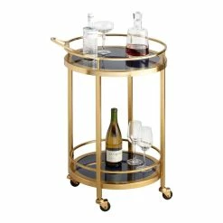 Smoke-black glass shelves give our two-tier bar cart its retro-glam look. Handcrafted of steel with a luxe gold finish, it offers a bottom shelf for holding spirits and a top area for serving. A handle and caster wheels facilitate ease of mobility to keep your party on a roll.