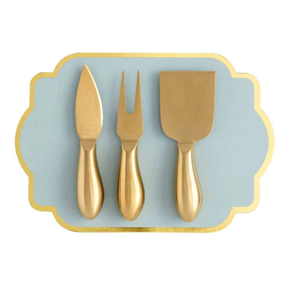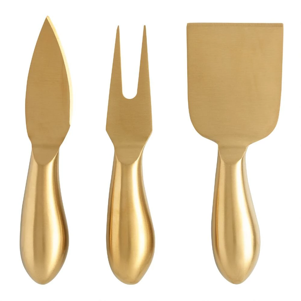 Featuring matte-gold rumbled finishes that add a luxe look to dining and entertaining, this trio of cheese knives makes for a refined hostess or housewarming gift. An essential set of tools for any serving board or platter, it includes a small spade for cutting and spearing hard cheeses, a flat chisel knife for cubing and dividing soft cheeses and a traditional two-pronged fork for serving aged and crumbly cheeses.