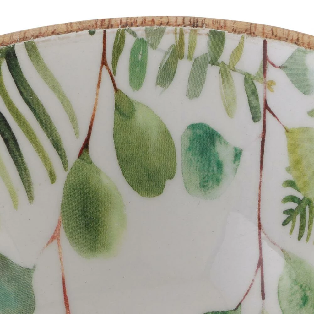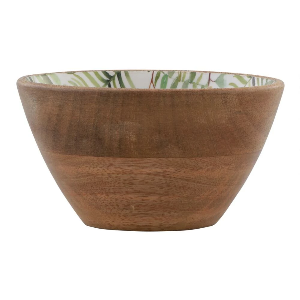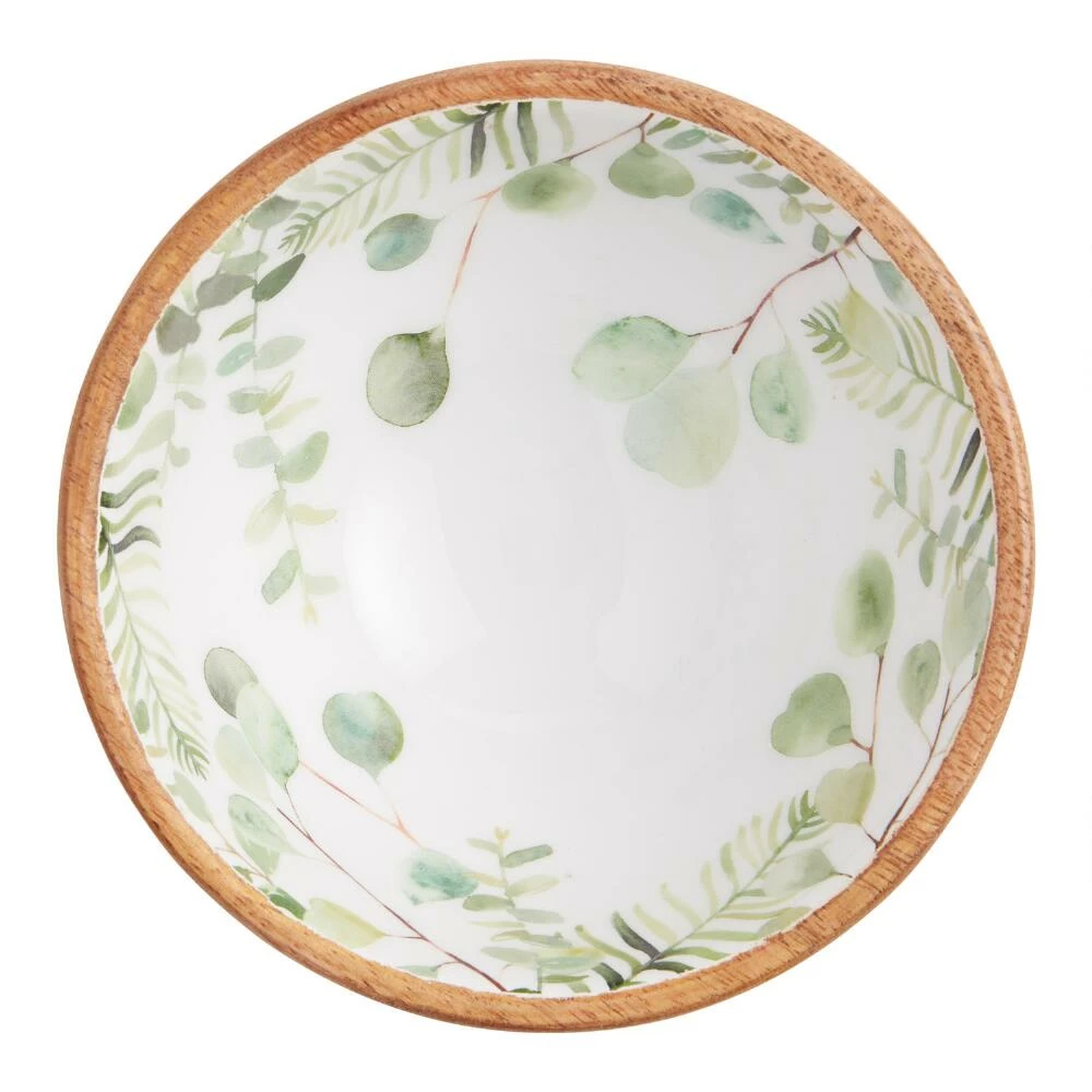 Crafted of natural mango wood with a white enamel interior featuring our exclusive green eucalyptus artwork, our botanical individual bowl adds a fresh presentation to homemade salads, sides and more. The contrast between the rustic exterior and easy-to-clean interior makes this small bowl perfect for entertaining indoors or out.