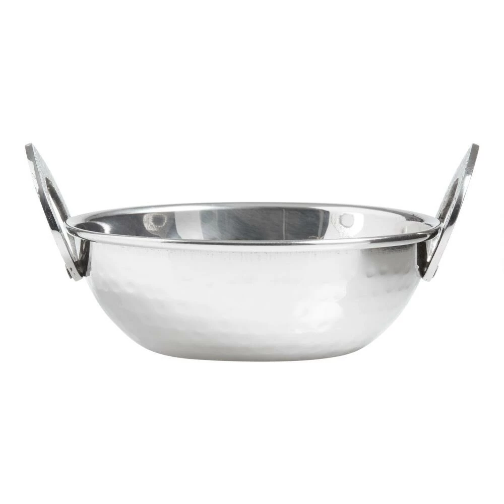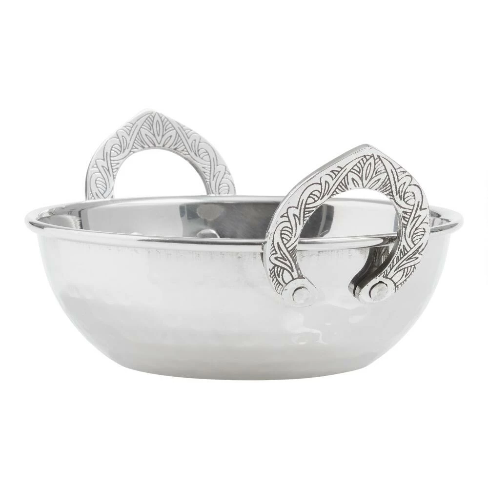 Crafted in India of stainless steel with a chic hammered finish, our small karhai bowl features upturned handles decorated with ornate scrollwork. Also called a kadai or karahi, a karhai is the traditional vessel used to serve Indian cuisine and is made of metal to keep food warm at the table. This exclusive serving bowl adds an authentic presentation to palak paneer, chicken tikka masala, red lentil dal and other classic favorites.