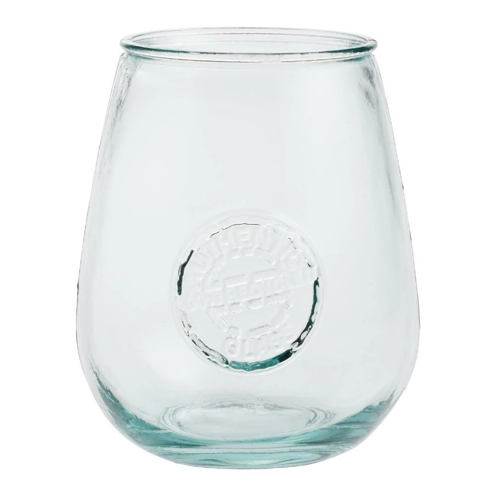 With a wonderful weighted feel in hand, our stemless wine glasses are handcrafted in Spain from 100% recycled glass with an attractive green tint. Each glass bears a decorative embossed stamp of authenticity and is perfect for serving guests everything from chilled orange juice in the morning to a hearty glass of red wine in the evening.