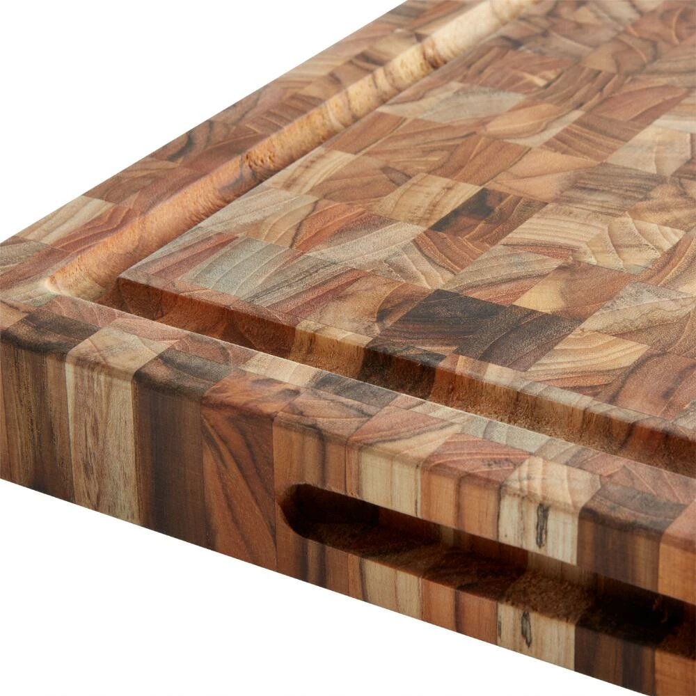 Made of end-grain teak wood sourced from a responsibly managed forest, this reversible TeakHaus BBQ butcher block is ultra-durable for use indoors and out. Displaying the unique color variations of pieced tropical teak, this thick chopping block is perfect for carving juicy oven-roasted and grilled meats. A 12×16 trencher cutting board that won’t dull knife blades, it requires only occasional oiling to preserve its distinctive beauty.