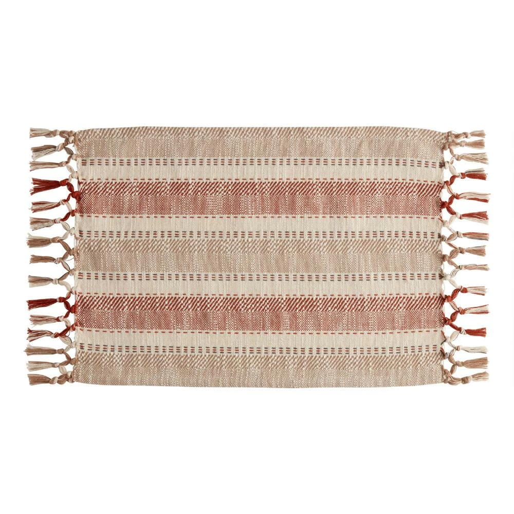 Bring warmth and texture to your table with our exclusive cotton placemats. Accented with knotted fringe, these woven placemats feature a striped design in a terracotta, tan and cream color palette that’s gorgeous on its own or layered with other table linens.