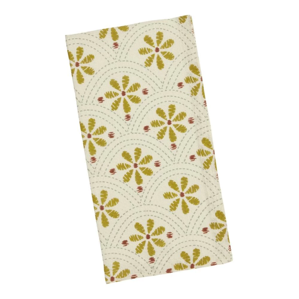 Made of soft, 100% cotton slub with a thicker, more textural weave, our white napkins are full of cozy charm and add a cheery vibe to mealtime. Covered with a vibrant print featuring yellow daisies, red dots and a gray scallop pattern with a hand-sewn look, they bring a pop of spring color to your table.
