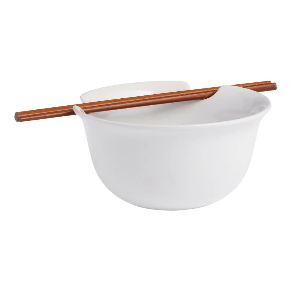 Streamline your place setting with our minimalist noodle bowl that has a clever groove in the lip to securely hold the included chopsticks. Made of sleek white stoneware and bamboo with a modern silhouette, our exclusive bowl-and-chopsticks set is perfect for everyday Asian-inspired meals and brings a Zen feel to dinnertime.