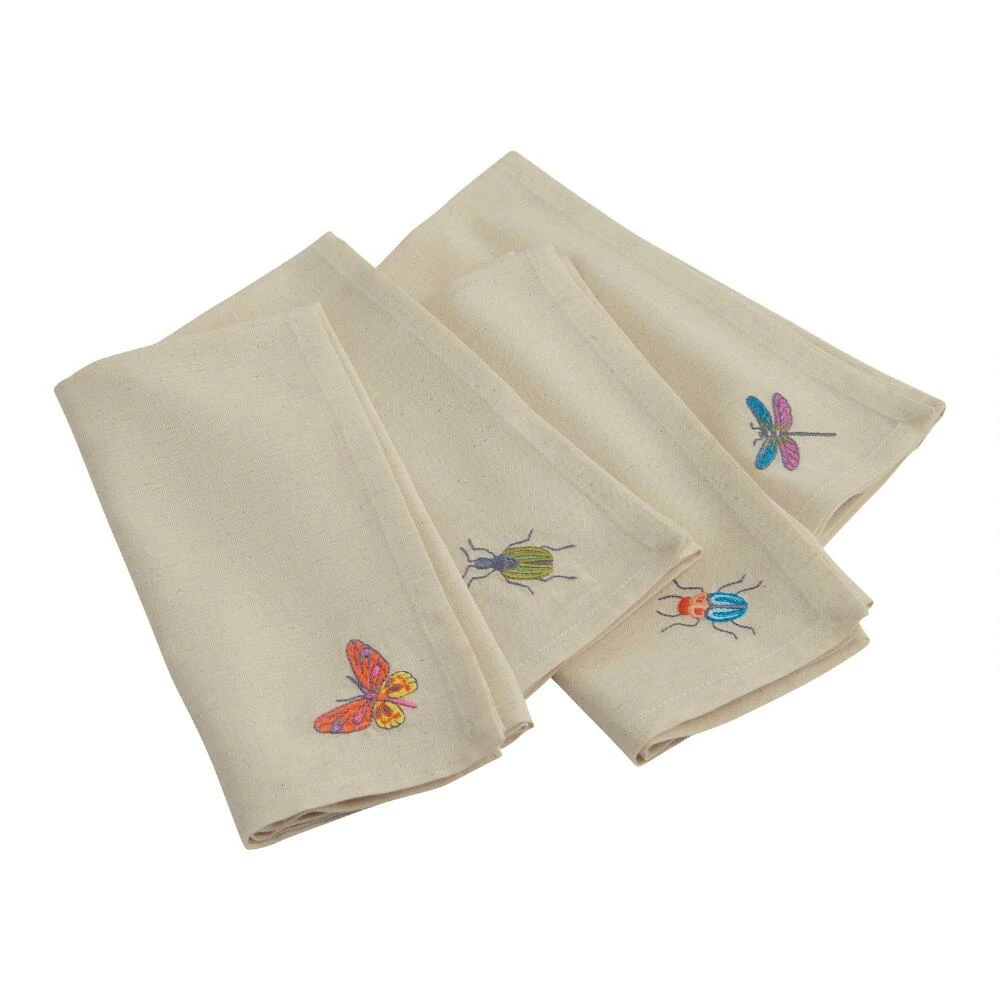 Create lively place settings with these soft white cotton napkins, made with a touch of linen and featuring colorfully embroidered beetles, dragonflies and butterflies. Buzzing and bright, these napkins make a playful addition to your collection of spring table linens.