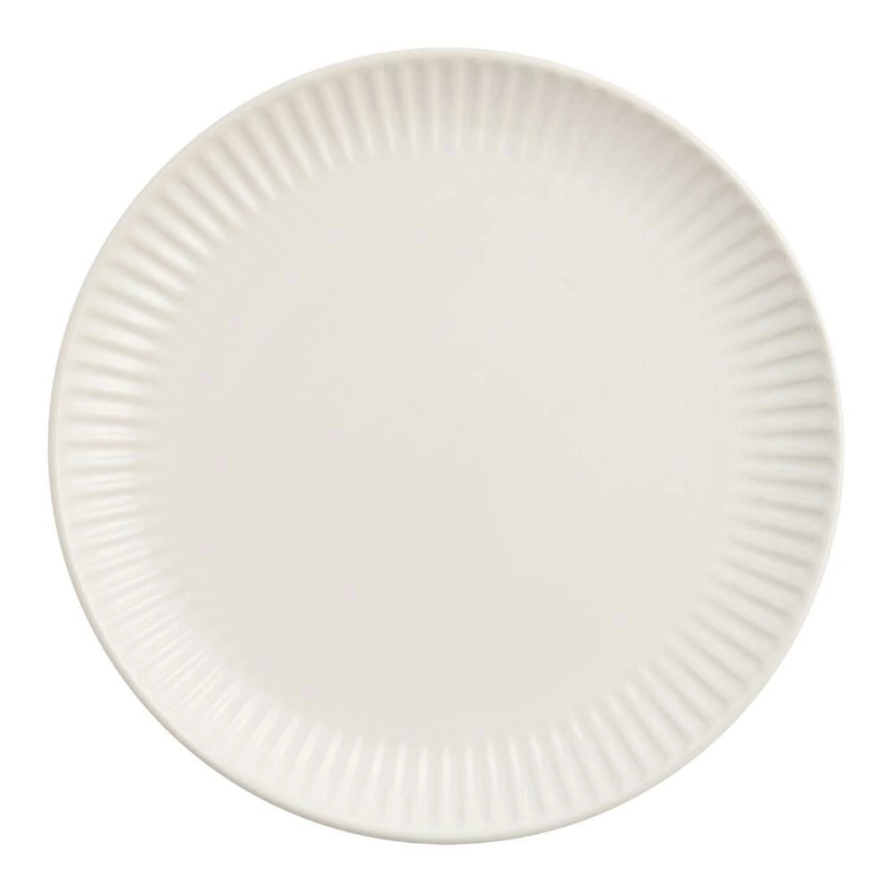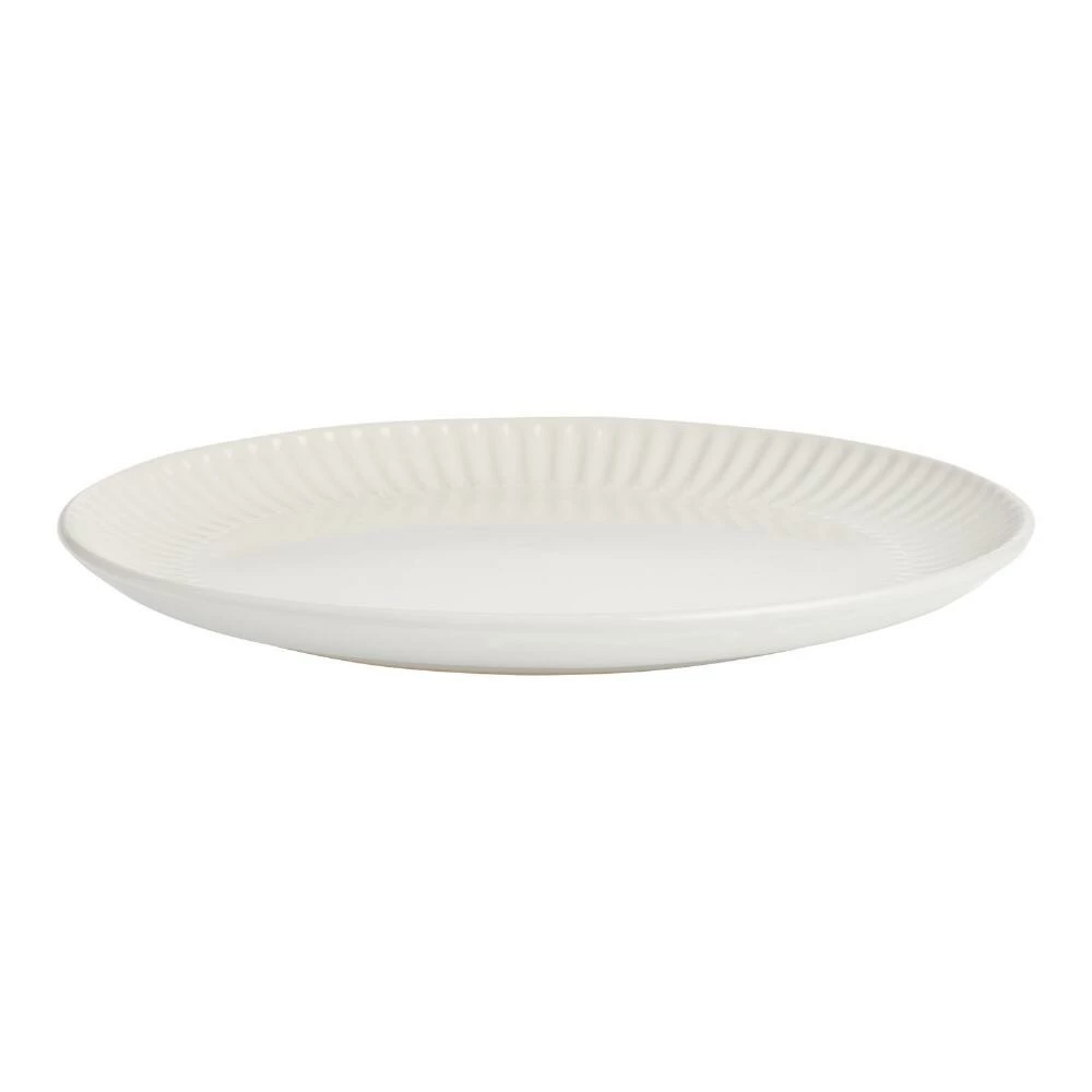 A playful take on classic dinnerware, this dinner plate has a glossy white glaze and tactile ribbed texture around the rim. Perfect for everyday dining, this timeless piece sets an artistic table when mixed and matched with your current place settings or paired with the rest of our collection.